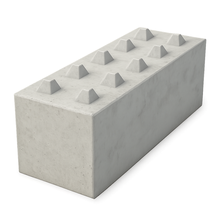 Блоки виготовляються з важкого бетону промислового класу міцності з дотриманням геометричної точності, що забезпечує стабільність конструкції та надійність експлуатації. Завдяки системі з’єднання типу «LEGO» елементи щільно фіксуються між собою без застосування розчину або додаткових кріпильних систем.